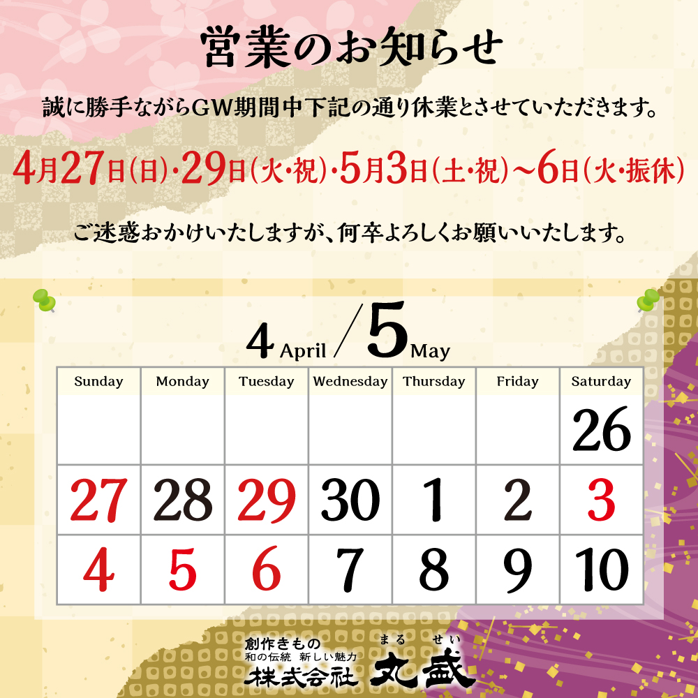 2025年04月25日 “GW期間の営業日のお知らせ”