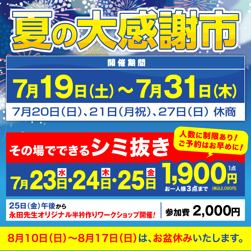 また、7/23(水)〜25(金)には、染色補正工芸士の永田先生による、“しみ抜きの実演会”を開催!